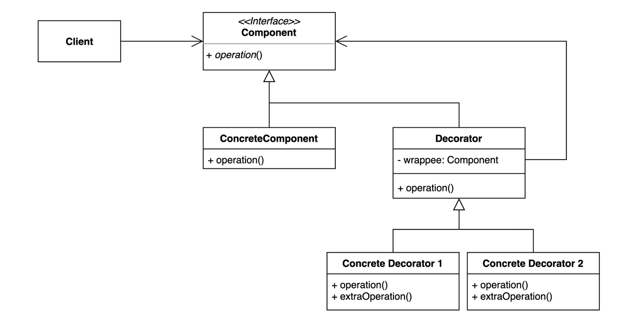 ConcreteComponent와 Decorator가 이를 구현하고 있다. 같은 오퍼레이션을 가지고 있다.