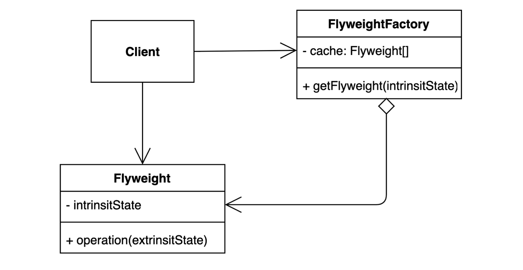 공통으로 사용하는 클래스(Flyweight)를 생성하는 팩토리 클래스(FlyweightFactory)를 만들어, 인스턴스를 최초 1개만 생성하고 공유하여 재사용할 수 있도록 하는 구조 패턴이다.