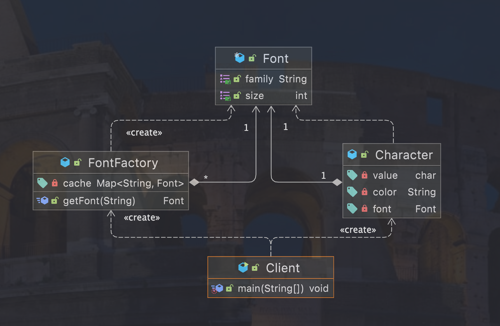 FlyweightFactory : Flyweight 인스턴스를 생성 또는 공유 (공장 역할)
