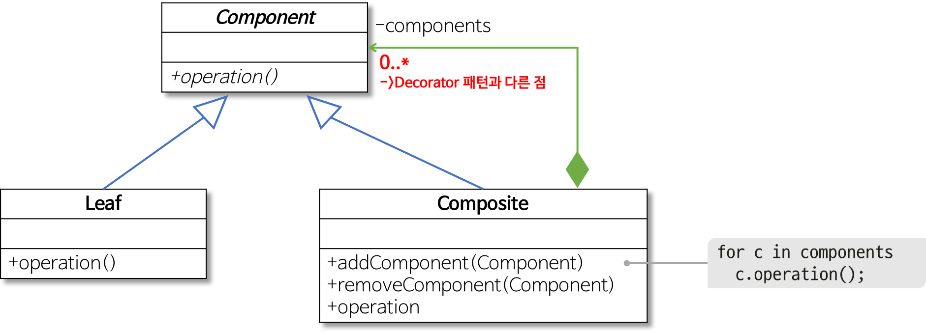 컴포짓도 컴포넌트안에 컴포넌트가 아래로 계속 존재하게 되고 트리구조처럼 이뤄지는 면에서는 또 인터프리터 패턴이 또 유사한 점이 있다.
