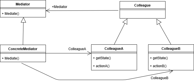 객체간의 종속성을 줄일 수 있는 행동관련 디자인 패턴. 객체 간의 직접 통신을 제한하고 중재자 객체를 통해서만 협력하도록 하는 패턴